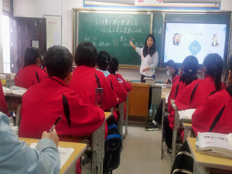 5月9日第一节课,张俊丽在8.2班示范课《庄子与惠子游濠梁之上》。学生王涵:“班主任用谜语猜人物引出庄子,对比庄子惠子的风格,初读课文了解重点词句及停顿,熟悉课文内容,引导学生翻译文言文内容,随后辩论巩固课文内容,最后走进人物心里加修饰词,然后带感情朗读。班主任这堂课,让我们从理解文章到走进人物心里,加深了印象。”张若水:“学习古文理解内容,认识惠子追求现实,实事求是的科研精神。”段一涵:“学习了文言文知识,体会到善于发现生活中的美好,感受大自然给予的温暖。”
