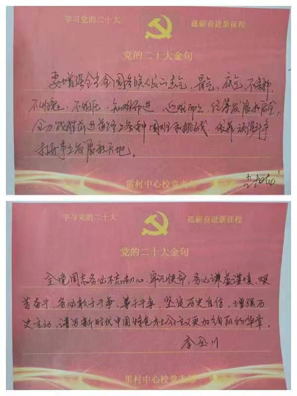11月15日下午,雷村中心校党支部开展十一月主题党日活动,传达学习党的二十大精神,教育引导党员教师全面贯彻习近平新时代中国特色社会主义思想,深刻领悟“两个确立”的决定性意义,牢记“为党育人的初心,坚定为国育才的立场”,坚持以昂扬的精神状态、务实的工作作风贯彻落实党的二十大精神,将学习成效转化为教育教学各项工作的强大动力。