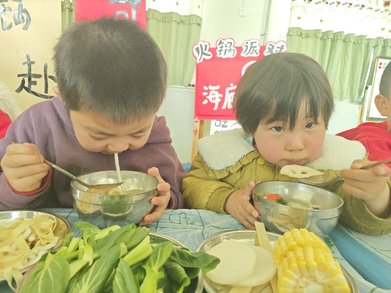 活动前,老师们准备好了各种各样的食材,琳琅满目,光看就已经开始流口水了。终于到了烫火锅、吃火锅的环节,“咕咚!咕咚!”喜欢的食材都下锅啦!牛肉、丸子、蔬菜宝宝顽皮地在锅里翻滚,孩子们目不转睛地盯着,垂涎欲滴,教室里香气四溢,我们等不及了,已经要开动了!孩子们兴奋不已,品尝着火锅的风味,探寻着火锅的颜色,感受围坐在一起团圆的快乐!