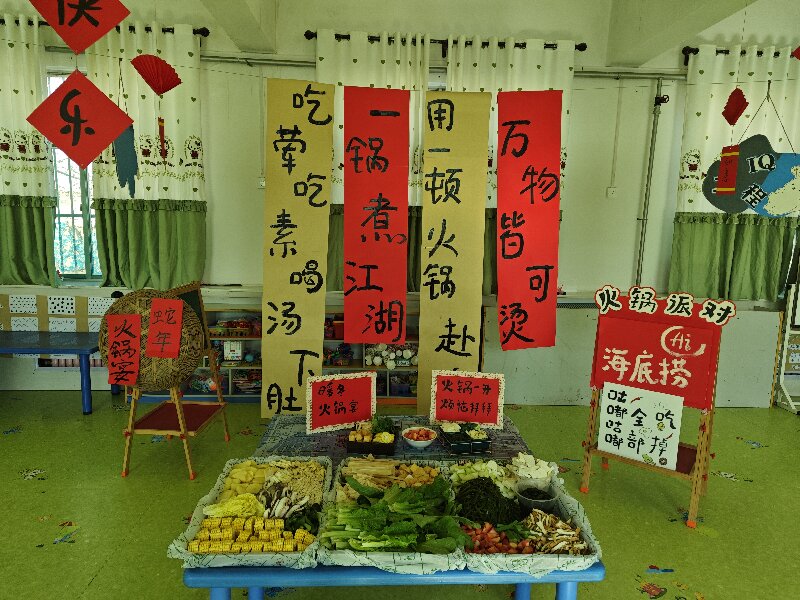 为了营造新年气氛,教师们利用课余时间进行了园内外环境创设,让元旦的氛围围绕着整个幼儿园,让小朋友们从身边感受到浓浓的新年味。老师还通过视频、课件、图片等向小朋友介绍元旦的由来以及火锅美食文化与意义,认识了吃火锅的各种食材以及它们的营养价值。