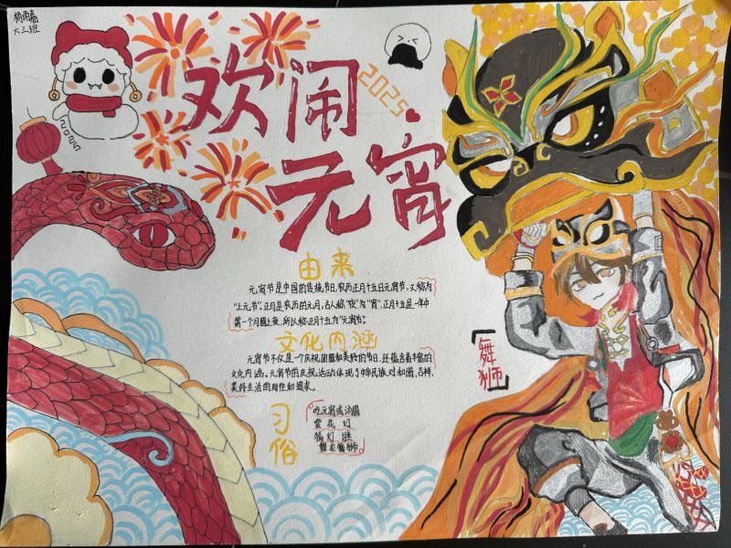 同学们精心准备,认真构思,充分发挥丰富的想象力,用心描绘心中的元宵节,制作出一份份精美的艺术作品。