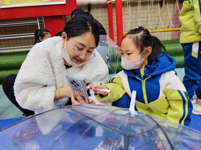 家长们也全身心投入,耐心地协助孩子,给予鼓励和赞美。一把把透明伞在孩子们的装扮下变得五彩斑斓,每一把都独一无二,承载着孩子们对妈妈和奶奶深深的爱。