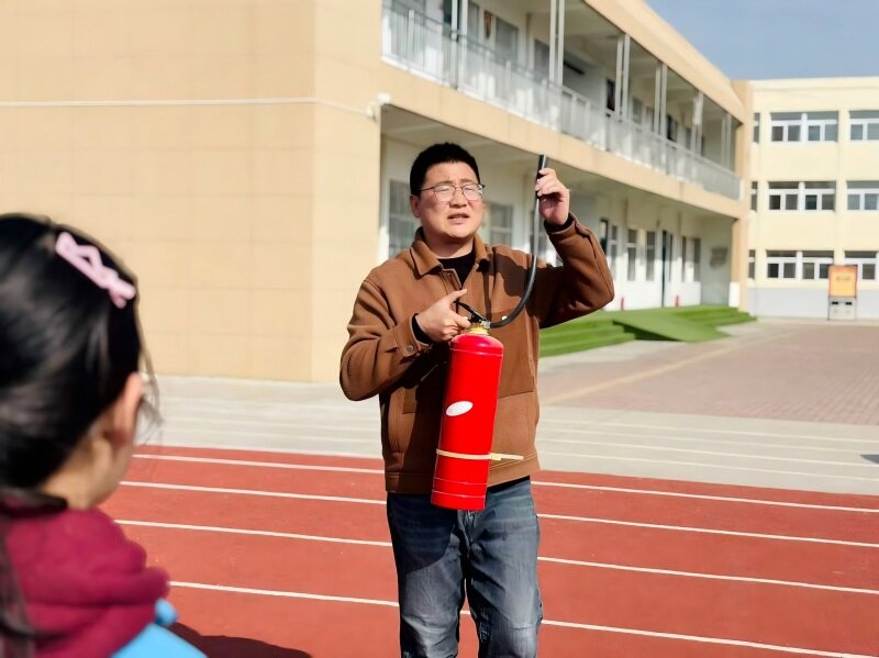 疏散演练后,陈勇杰老师在操场中央开展消防器材实操培训。他以干粉灭火器为例,详细拆解了筒体、压力表、喷嘴、保险栓等核心部件,演示了提握瓶体、拔出保险销、瞄准火焰根部、按压手柄的标准化操作流程,并强调上风向站位、保持安全距离等注意事项。随后,教师代表与高年级学生分组进行模拟灭火练习,陈老师逐一纠正操作姿势,确保参与者掌握关键技能。