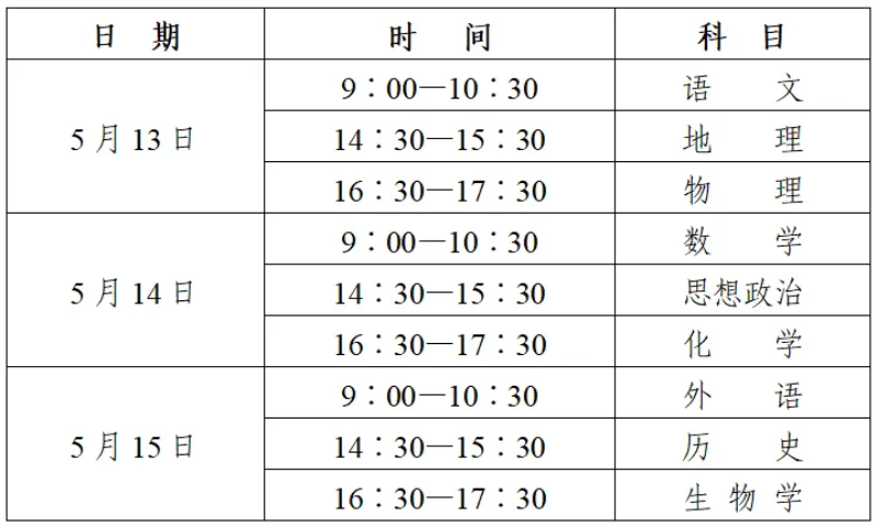1.笔试科目。语文、数学、外语、思想政治、历史、地理、物理、化学、生物学等9科采用笔试方式。考试时间安排如下: