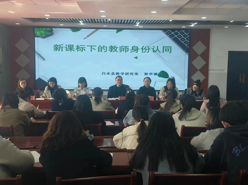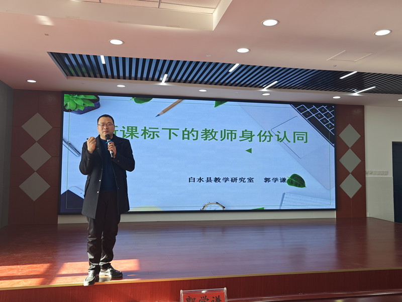 郭学谦为共同体成员作了题为《新课标下的教师身份认同》讲座,讲座围绕理想课堂、高效课堂、有效课堂展开。鼓励教师做学生发展的引导者和促进者,通过课堂革命推动学习革命,提升课堂效果。