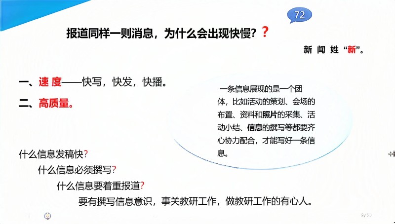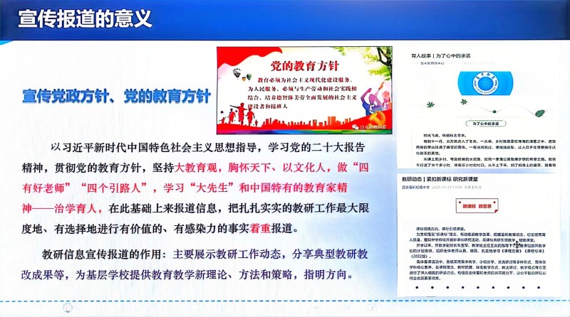 专题报告结合教研工作实际,分类列举典型事例,从白水县教研室宣传工作简介、信息的理论知识和怎样撰写信息三个方面及信息的定义、教研员撰写信息所具备的基本素养、教研信息的现状、宣传报道的意义、信息的组成部分、信息的结构、信息的特点、采集照片、需要注意的问题等部分作详细地阐释和说明。报告着重就信息的标题、导语、主体进行了具体说明,强调了“三度反复”是消息特有的一种叙述方式,且层层递进。报告明确,宣传工作要始终坚持党的路线、方针和政策;并选取有价值、有感染力的扎实教研事实进行着重报道。此外,还介绍了通讯、简讯、短消息、长消息、综合消息等。