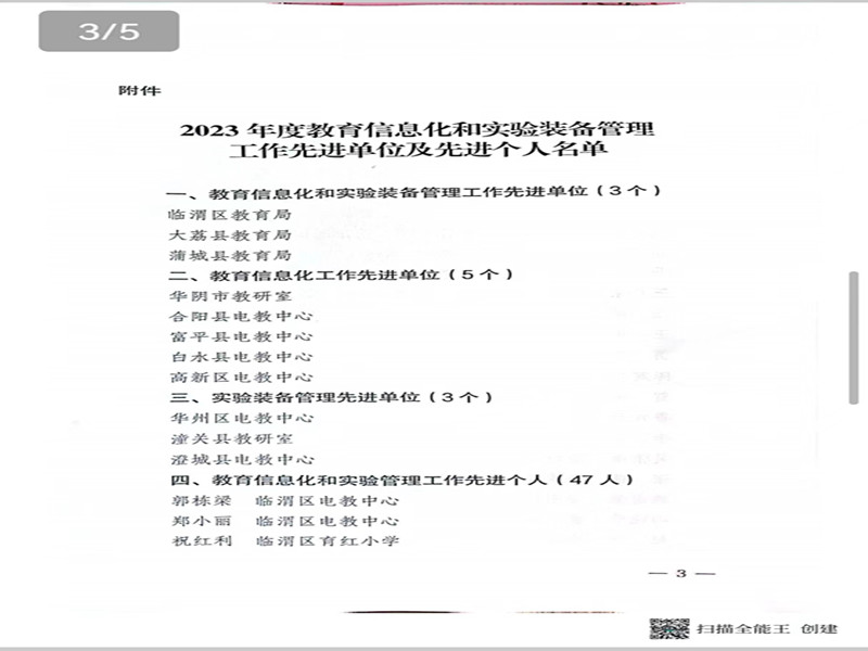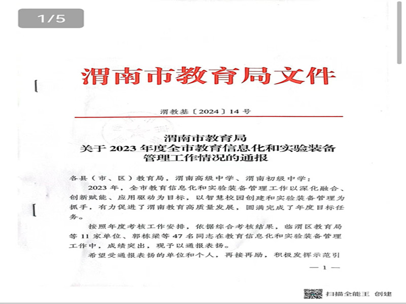 近日,渭南市教育局对2023年度教育信息化和实验装备管理工作中成绩突出、表现优异的单位及个人进行了表彰。白水县电教中心荣获2023年度教育信息化工作先进单位称号,李鹏等三人获教育信息化管理工作先进个人殊荣。