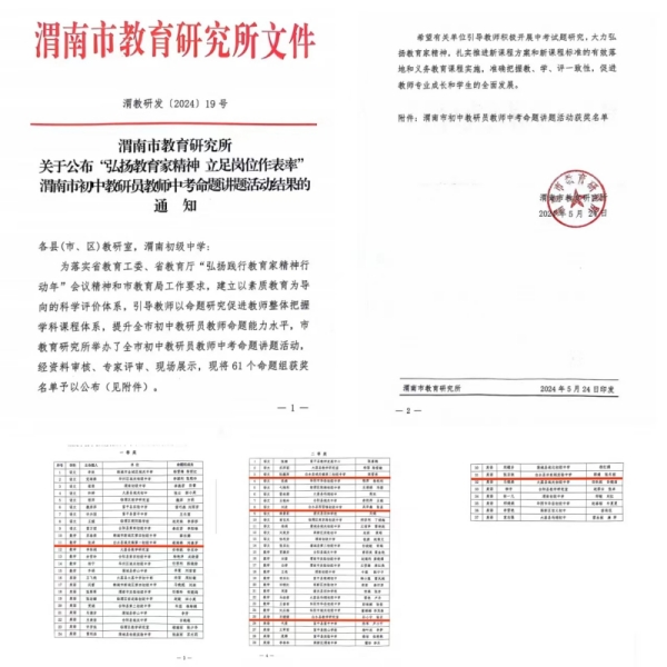 全县各初中积极参与本次活动,教研室共收集命题46套,经过县级评审,择优报送渭南市教研所参赛。各参赛命题组制定了详细的双向细目表,并将命题电子版材料上传,随后将讲解内容制成PPT,于5月21日参加市级讲题比赛。在各命题组的精心准备和协作努力下,我县取得了优异成绩,参赛的6组命题,有一个组荣获市级一等奖,四个组荣获市级二等奖。