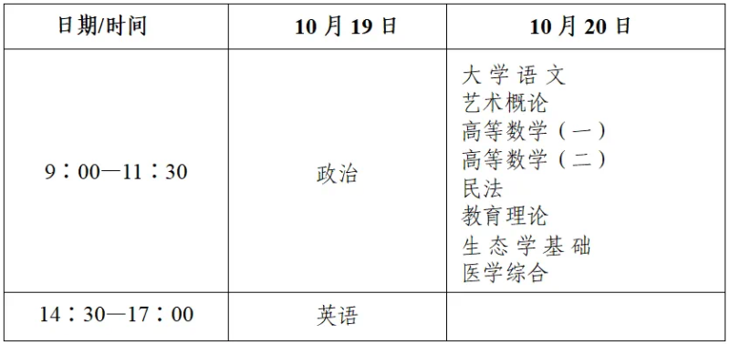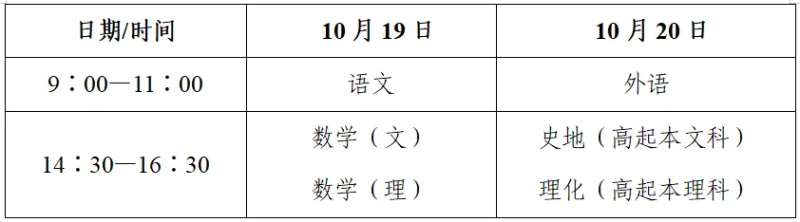 第十五条 全国成人高校招生统一考试定于10月19日、20日进行。考试时间如下: