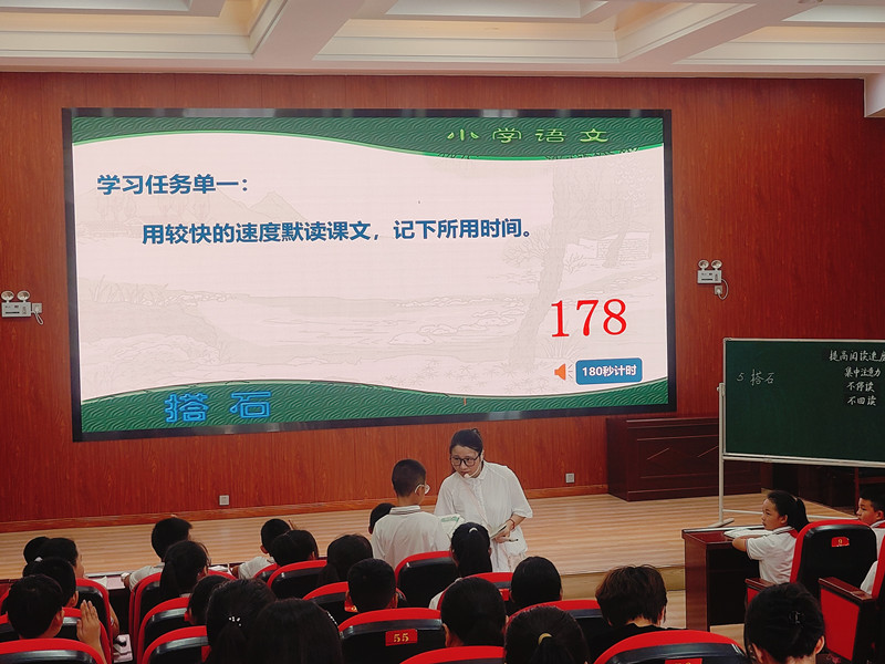 金老师执教的是五年级上册第二单元的课文《搭石》,她从单元导读入手,让学生明确本单元的语文要素——学习提高阅读速度的方法。阅读的策略是“集中注意力,不停读,不回读”,整个教学过程紧扣这一语文要素,以任务单为驱动,让学生在计时中默读,呈现三次不同的默读任务,循序渐进的训练学生的默读速度,默读中既有方法的指导,又有对课文内容理解的指导,同时将简单枯燥的讲解转化为有趣的“课堂练习”,通过手势与老师交流对错,激发了学生的学习兴趣,在轻松愉悦的氛围中实现了乐中学,学中乐。整个课堂中学生回归学习主体,成为了学习的主人,体现了“自主探究”的学习方式。
