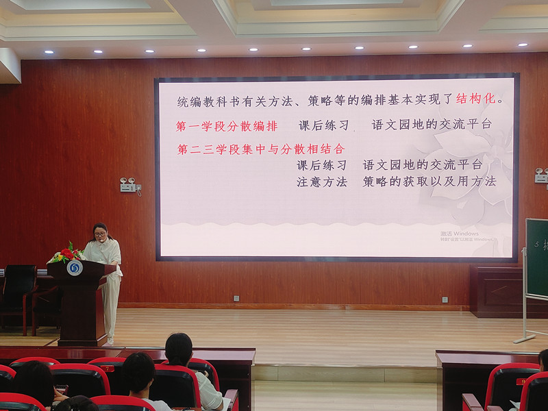示范课结束后,金老师还以部编版五年级上册第二单元为例做了“以单元任务群为抓手,用方法提阅读速度促深度阅读,努力构建素养导向的教学课堂”精彩讲座,她从自身教学经验告诉大家要精研课标,深挖教材之间的联系,提高单元备课意识,给予学习策略,渗入学习过程,通过迁移与运用,实现轻松教和愉快学的目标,让我们更加清楚语文教师的使命感和责任感,为语文课堂教学指明了方向。
