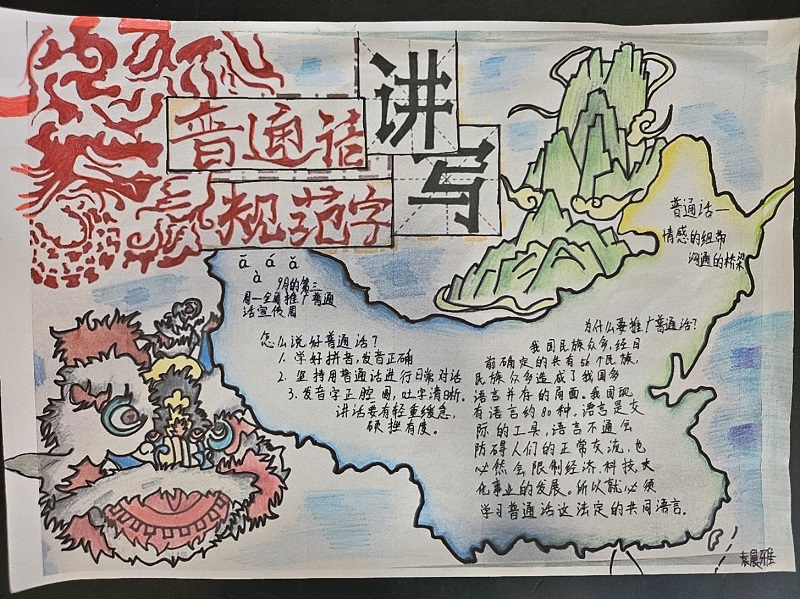 最后同学们在课下充分发挥自己的想象力和创造力,用手中的画笔绘制出一幅幅精美的手抄报,为其他青少年树立榜样,带动更多的人参与到说普通话、做文明人的行动中来。