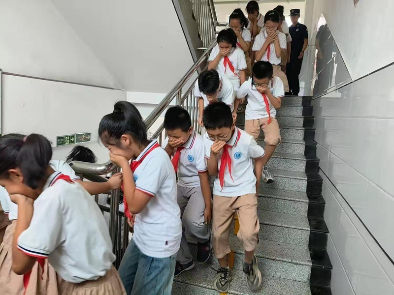 随后,伴随着急促的防火警报声,消防演练正式开始,学生们在老师的引领下,弯下身子,捂住口鼻,迅速有序地向安全地带撤离,在撤离过程中,孩子们冷静、迅速、有序,老师指挥得当。