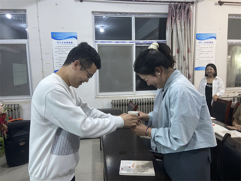 师父就坐,徒弟列队行“敬茶礼”。一次敬茶,一份承诺,青蓝携手共成长!师父回赠书籍作为礼物,寓意着知识与责任的传递与延续。
