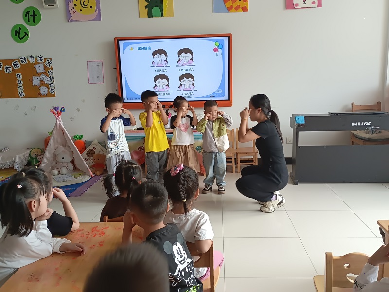 眼睛是心灵的窗户,更是儿童探索世界的万花筒。0—6岁是幼儿视觉发育的关键期,也是早期近视防控的重要期。因此,各班教师和小朋友通过游戏的形式,引导幼儿了解保护眼睛的重要性,从小规范用眼习惯,增强爱眼、护眼意识。