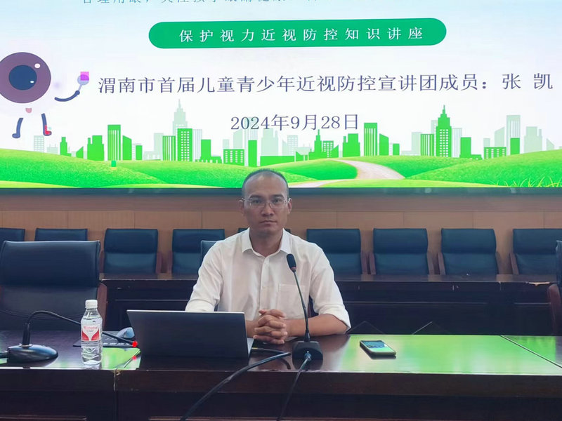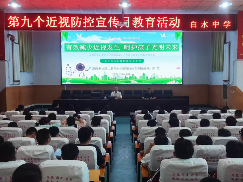 2024年9月28日下午,在白水中学多功能会议室举行了《有效减少近视发生 呵护孩子光明未来》近视防控宣传教育专题讲座。讲座由白水中学德育处副主任王洁老师主持,宣讲嘉宾来自渭南市儿童近视防控宣讲团的张凯老师。
