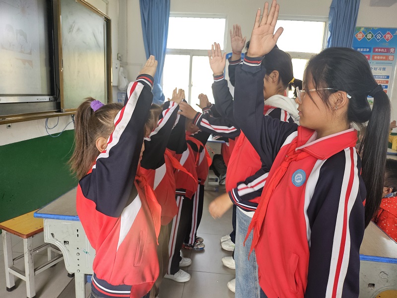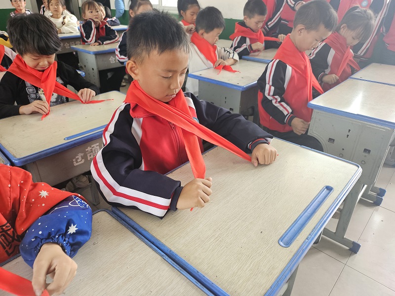 大队辅导员老师带领高年级少先队员代表向预备队员们展示了如何正确佩戴红领巾,如何规范敬队礼,每一个动作都细致入微,确保每个队员都能学到正确的方法。预备队员们个个都精神饱满,在老师和高年级队员们的指导下亲手体验了佩戴红领巾的庄严与自豪,跟随着哥哥姐姐们的动作认真模仿,更深刻地理解了人民的利益高于一切。