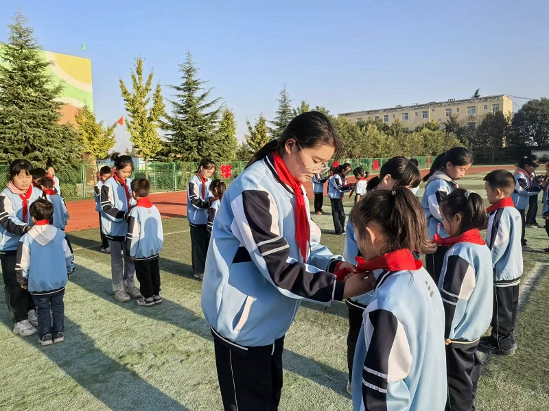 随后,高年级学生为新队员们佩戴上了红领巾,他们神情严肃,态度认真,因为他们知道这是祝贺,也是革命力量的传承。新老队员互敬队礼表达敬意与感谢。