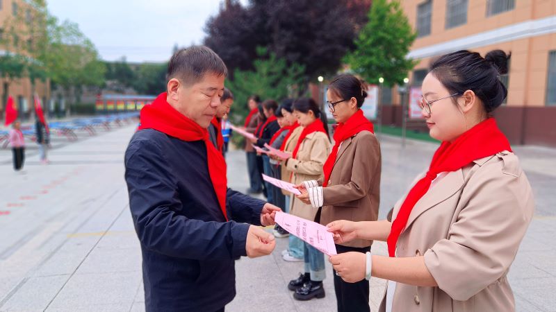 党支部副书记王建国,副校长赵平、杨志锋,校团委书记李喜玲,党支部青年委员贺玉玲,大队辅导员代宁出席此次活动。少先队员代表为领导们敬献红领巾,表达敬意。