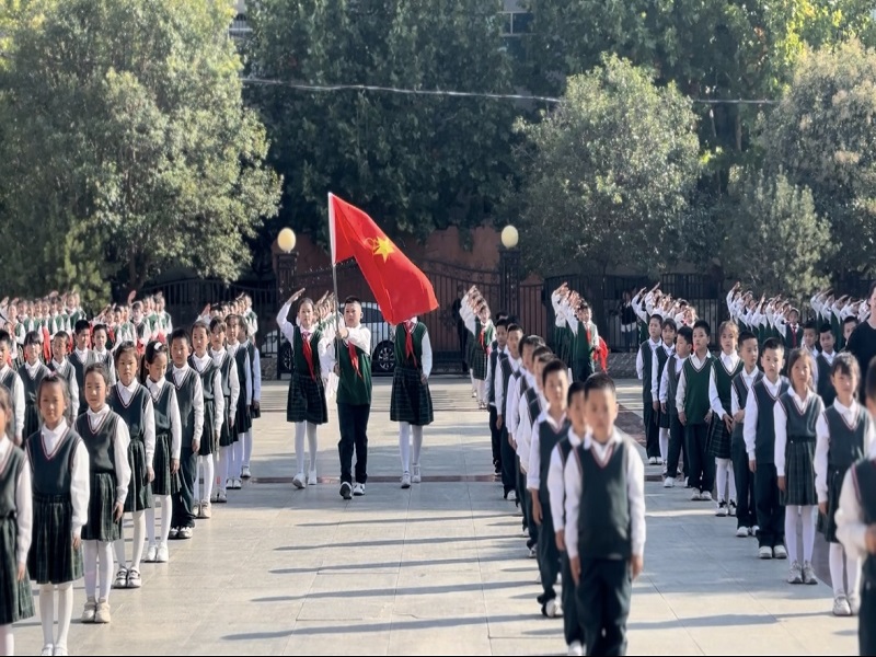 在雄壮激昂的《出旗曲》中,护旗手们迈着坚定的步伐,护卫着鲜艳的队旗入场。全体少先队员肃立敬礼,高唱队歌,嘹亮的歌声在校园上空回荡。