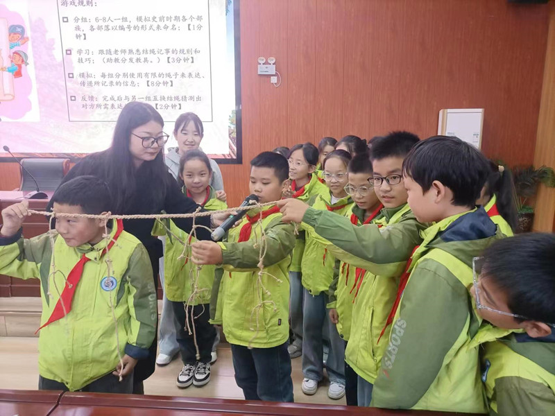 本堂课围绕汉字的起源、汉字始祖仓颉以及汉字的奥秘三个部分。在汉字的起源部分,老师们带领学生们通过小组合作、实际动手操作,感受着古人结绳记事的生活方式,体会到了古人结绳记事的独特之处与弊端。 为了更深刻地了解汉字始祖仓颉 ,老师通过播放动漫小视频,使大家一同观看仓颉造字的传奇过程。同学们认真观看,仿佛与仓颉一同经历创造文字的艰辛与喜悦,也被仓颉无穷的智慧与造字的毅力深深折服。最后,老师给学生们讲解了汉字的演变过程,通过具体的汉字的演变,使同学们感受到中国汉字的有趣以及书法艺术中蕴含的意韵美,激发着全体学生生对汉字、书法的热爱。