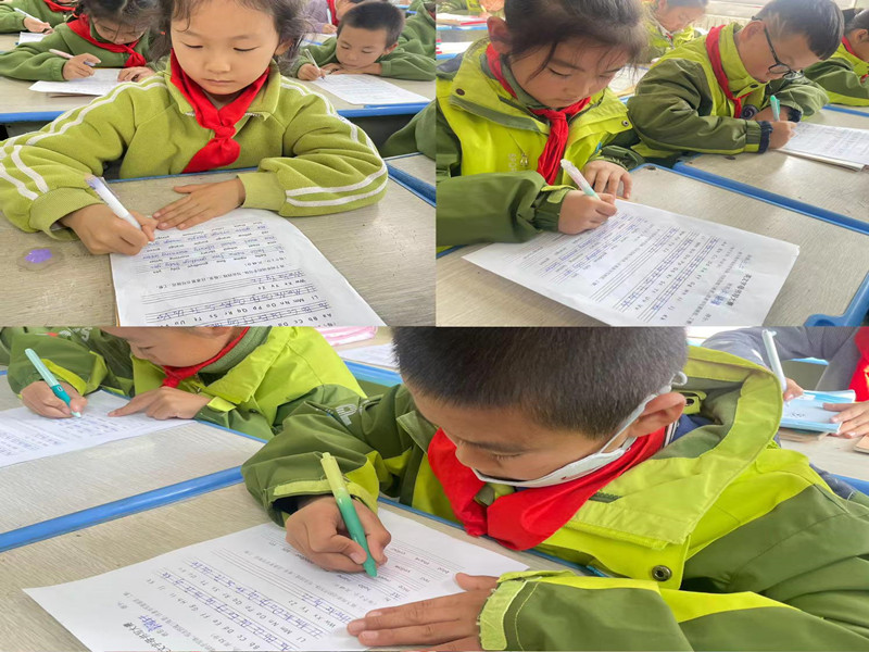 比赛以班为单位,全体三年级学生共同参与。瞧!比赛现场,学生坐姿端正,握笔正确,神情专注。他们手握笔杆,认真而从容的书写着每一个英语字母。一个个英文字母像跳跃的音符,在孩子们的笔下熠熠生辉。不但展示了扎实的英语书写功底,而且展现出学生们极大的热情和认真的态度,书写作品美观整洁,让人赏心悦目。