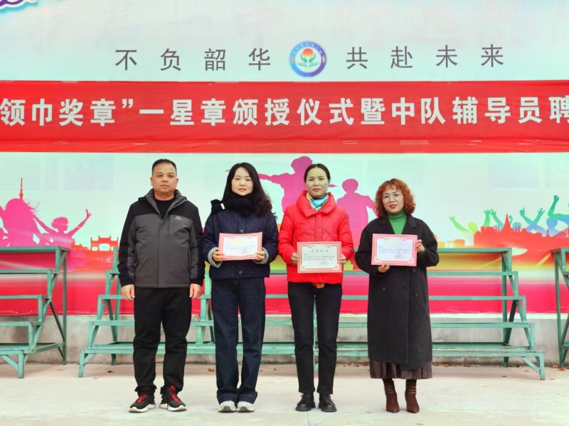 副校长张周宏为荣获集体一星章的王会会、任杨会、贺志敏三位中队辅导员颁发了荣誉证书。