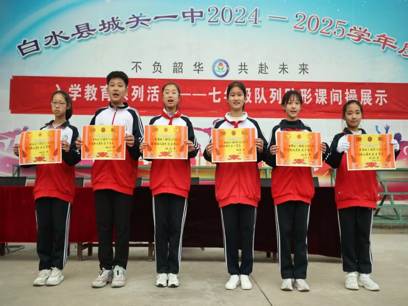 经过激烈角逐,评委们仔细打分,年级副主任赵静宣布了比赛结果:七年级十一班等6个班级分别荣获一、二、三等奖。郭沫含等七位同学荣获优秀指挥员称号。副校长王德红、行政交流中心主任王智文等领导,代表学校先后为获奖班级和个人颁发了荣誉证书。