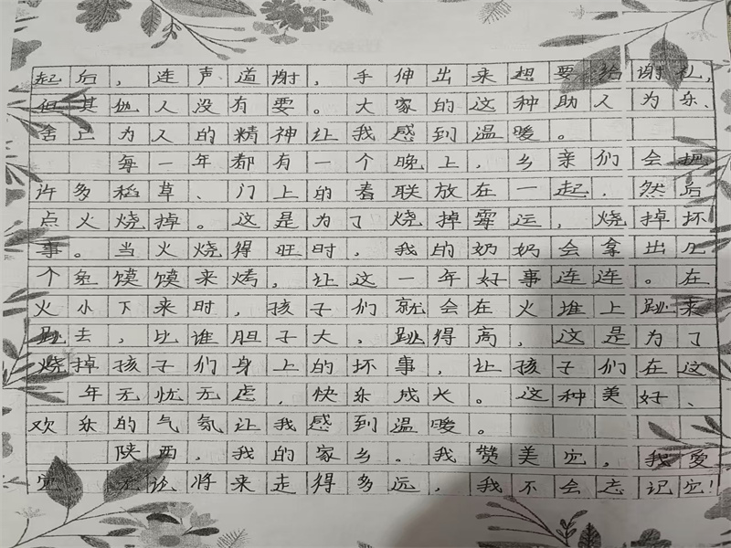 本次作文竞赛活动分中年段和高年段,在各班教室举行,三四年级以“我爱我家”为主题,五六年级围绕家乡的人和事及家乡的民风民俗等进行书写,旨在让学生贴近生活,从生活中选取素材,书写对家乡的喜爱。