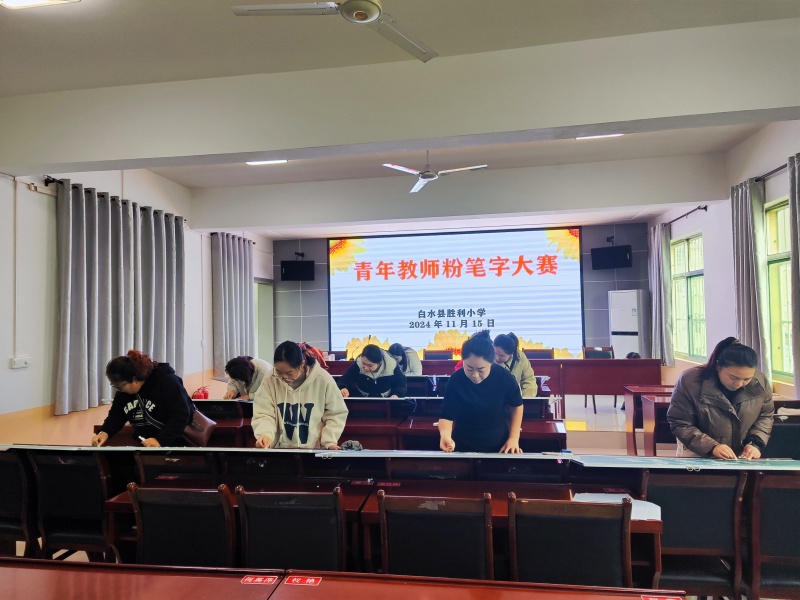 为促进教师专业化发展,提高教师教学基本功水平,展示教师良好的职业素养,在全体教师中形成一种自觉苦练教学基本功的氛围。胜利小学于2024年11月15日早晨举行了青年教师现场粉笔字比赛活动。
