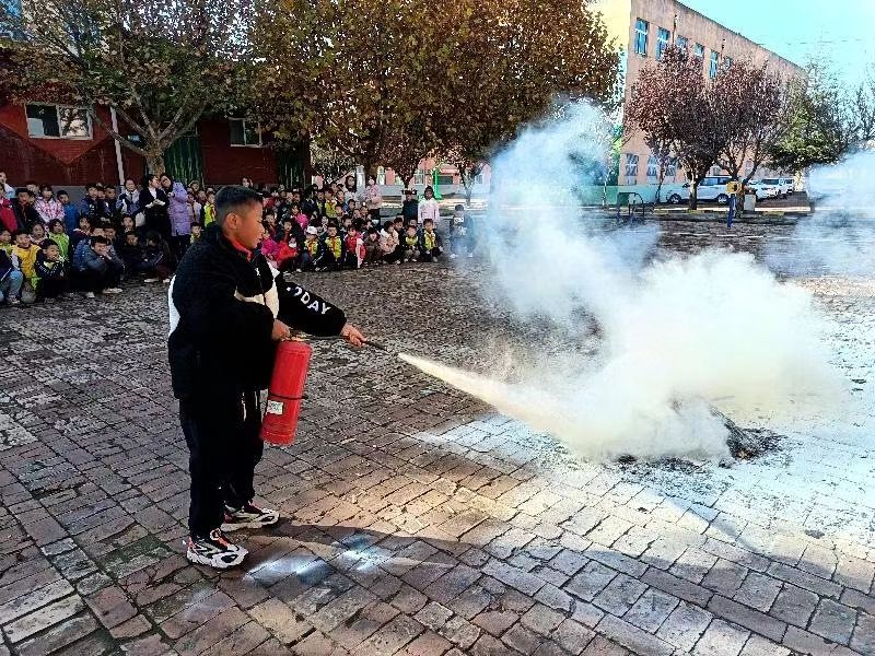 最后,大家集中到学校操场,各班快速整队并核查清点人数逐级汇报。演练共用时1分零19秒,所有师生均安全撤离到安全地带,整个过程组织严密、紧张有序、安全规范,达到了预期效果。随后,老师教学生怎样正确使用干粉灭火器,强调一定要对准火源根部进行灭火,这样才会快速灭火。