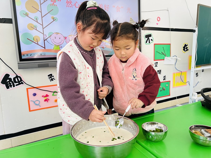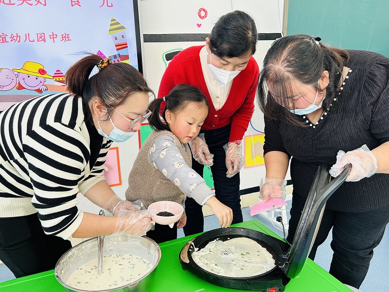 中班制作的是地方传统面食——煎饼,孩子们在家长的带领下从食材准备到美食享用热情四溢,有了孩子们的参与,煎饼也散发着独特的香味。