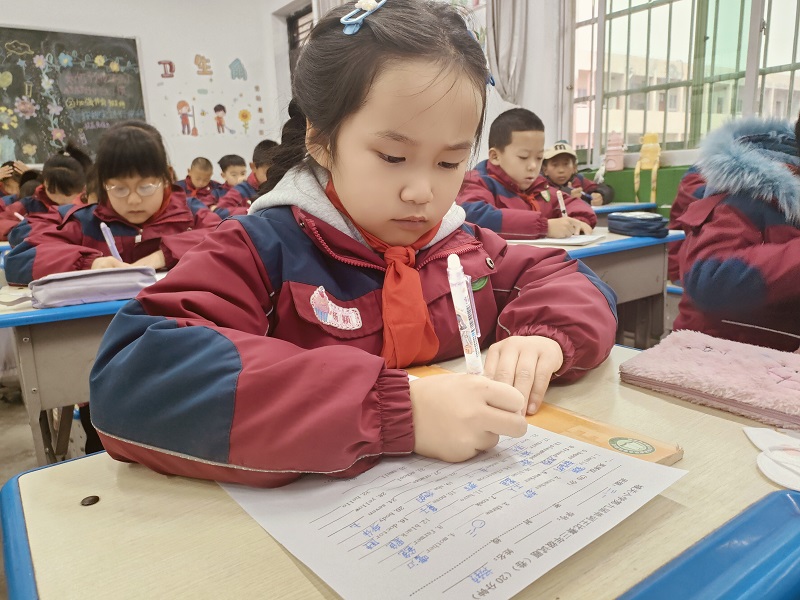 比赛现场气氛紧张而有序,孩子们铆足了劲,凭着扎实的英语功底专心书写。时而低头沉思,时而奋笔疾书,一个个单词跃然纸上。