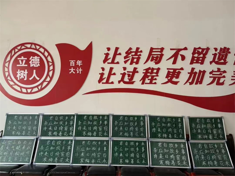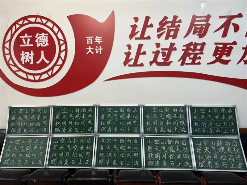 一支粉笔育桃李,方寸之间展功底。教师们将身心融于笔端,尽情挥洒粉笔,将一幅幅书法作品呈现在黑板上,行云流水,自然舒展。一横一竖,一撇一捺,笔笔显功力,字字显神韵,展示了教师们的书写风采。