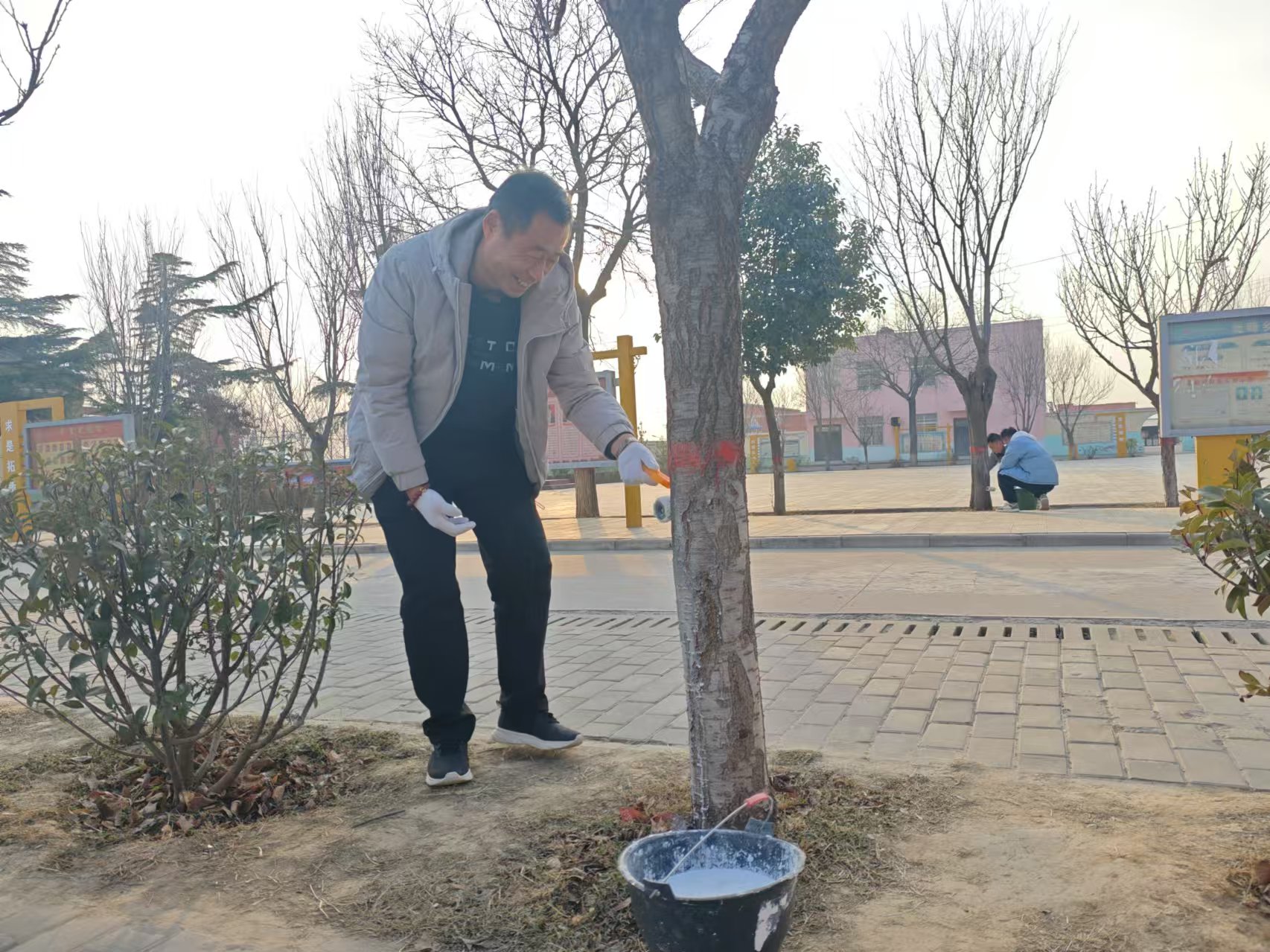 寒冬渐至,校园里的树木也亟需抵御低温。12月24日,北塬乡中党支部组织党员教师们纷纷化身“护树使者”,开展了一场别开生面的树木涂干活动。