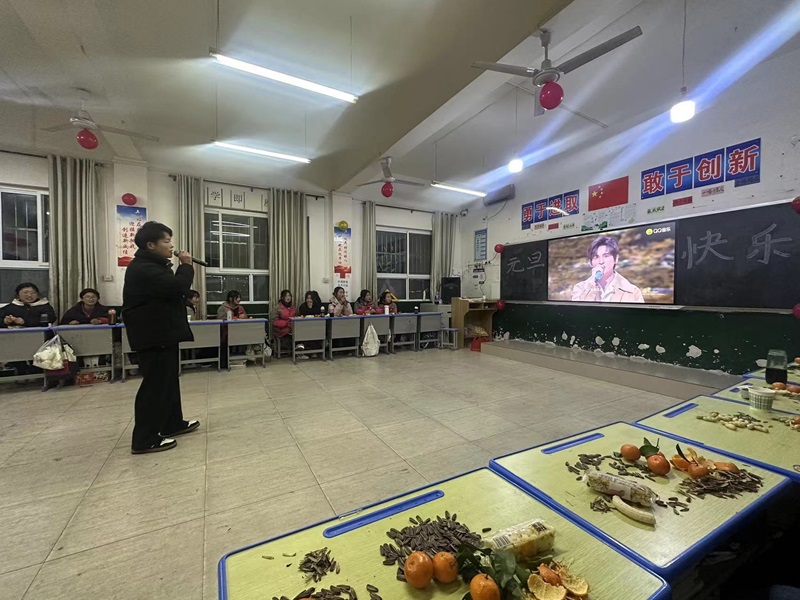 当熟悉的《青花瓷》旋律响起,袁老师的深情演唱宛如一阵清风,拂动着每一位听众的心弦。脸上带着温暖的笑容,仿佛从江南烟雨中走来。“素胚勾勒出青花笔锋浓转淡,瓶身描绘的牡丹一如你初妆”,袁老师用温柔且富有韵味的嗓音,将这婉转的歌词轻轻唱出,那细腻的声线犹如在诉说着一段古老而浪漫的故事。让观众们沉浸在那充满诗意的画面中,仿佛看到了那精美的青花瓷,以及隐藏在其背后的深情厚意。一曲终了,台下爆发出热烈的掌声,久久回荡在校园的上空,为这个元旦增添了一抹别样的文化韵味与温馨色彩。