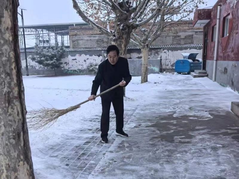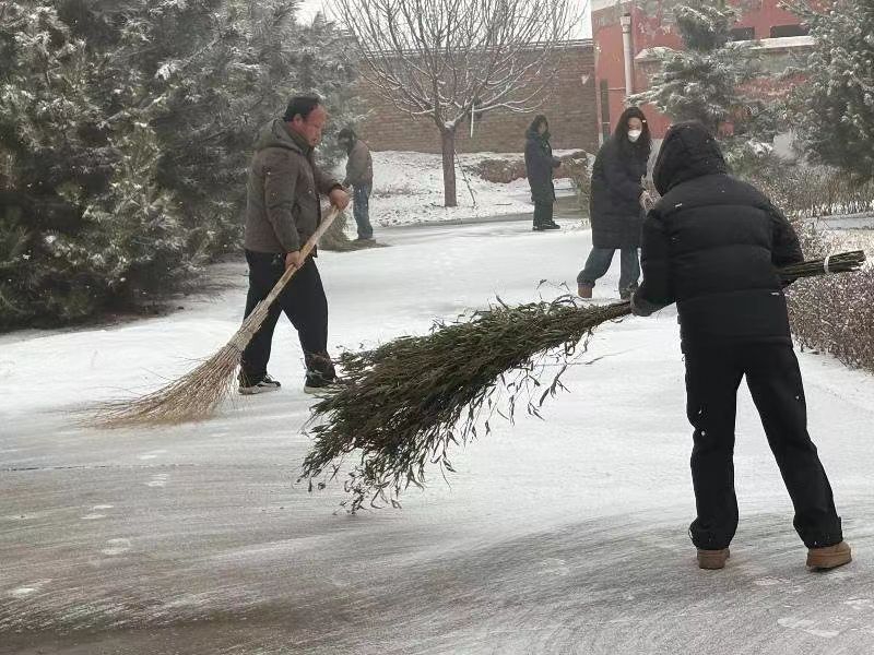 扫雪行动迅速展开,老师们分工明确,有的负责铲除积雪,有的负责清扫路面,有条不紊地将积雪扫至指定处。大家齐心协力,配合默契,劳动的热情有效地驱散了天气的寒冷。大家齐心协力,默契配合,高涨的劳动热情让校园满是暖意,不多时,主要通道的积雪便清理完毕。