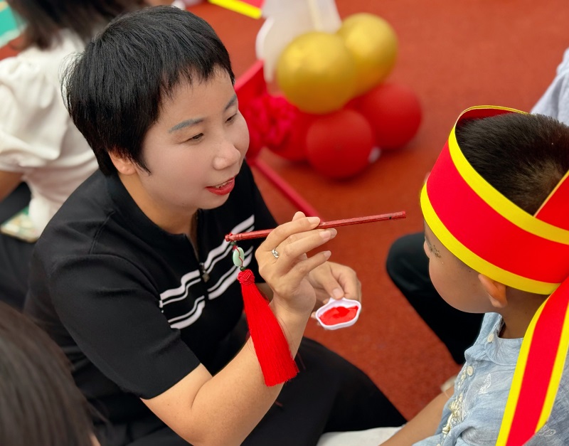 园领导在孩子们额头正中点上红痣,寓意“破蒙开慧”,以朱砂启智传递美好期许。