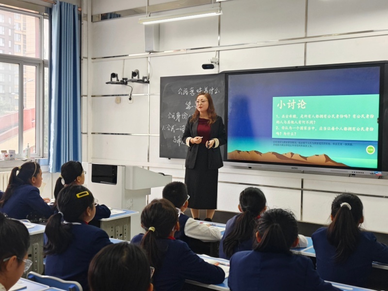 公开课上,四位教师各展风采:白雪老师讲授的是三年级上册《生活离不开规则》。她巧妙创设“规则小侦探”情境,将课堂变成侦探社,学生们化身小侦探,在“课间走廊的怪象”“马路红绿灯之谜”等四个生活案件中搜集证据、破解规则密码。通过情景对比、小组讨论,孩子们自主发现规则背后隐藏的安全、尊重、公平等价值。“规则不是束缚,它让生活更美好!”白老师用游戏化教学点亮课堂,用“心中的红绿灯”引导学生感悟自律的真谛。这堂课既充满童趣,又蕴含深意,让规则意识如春雨般滋润孩子心田。邓娇娇老师讲授的是五年级上册《主动拒绝烟酒与毒品》。邓老师从学生熟悉的生活场景和认知特点入手,精心设计了系列富有启发性的活动,引导学生逐步认识烟酒、毒品的危害,树立主动拒绝的意识。她语言生动,条理清晰,善于调动学生思考,让学生在互动探究的氛围中,完成从知识认知到行为自觉的转化,深刻理解“珍爱生命,远离烟酒毒品”的重要意义,为形成健康的生活方式和正确的价值观筑牢根基。申妮娜老师讲授的是六年级年级上册《公民身份从何而来》。她围绕“公民身份”引导学生理解什么是公民以及公民身份的取得,培养树立学生的公民意识,并知道该国法律享有的权利和承担的义务,为六年级学生开展生动的法治启蒙教育。李娟老师讲授的是六年级年级上册《公民身份从何而来》。讲课时采用图片、情境、视频演示进一步加强学生理解公民的内涵、了解公民和国籍的关系,理解公民与国家的法律关系,增强学生对自己中国公民身份的认同感和责任感。