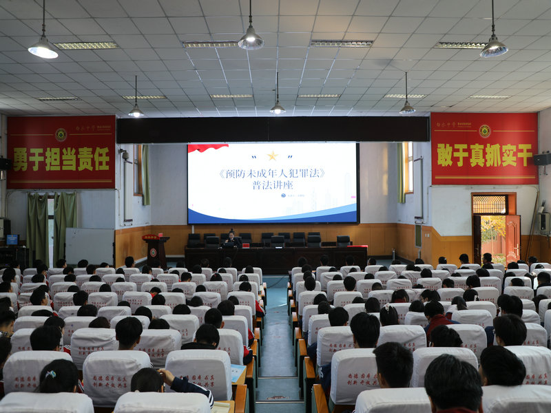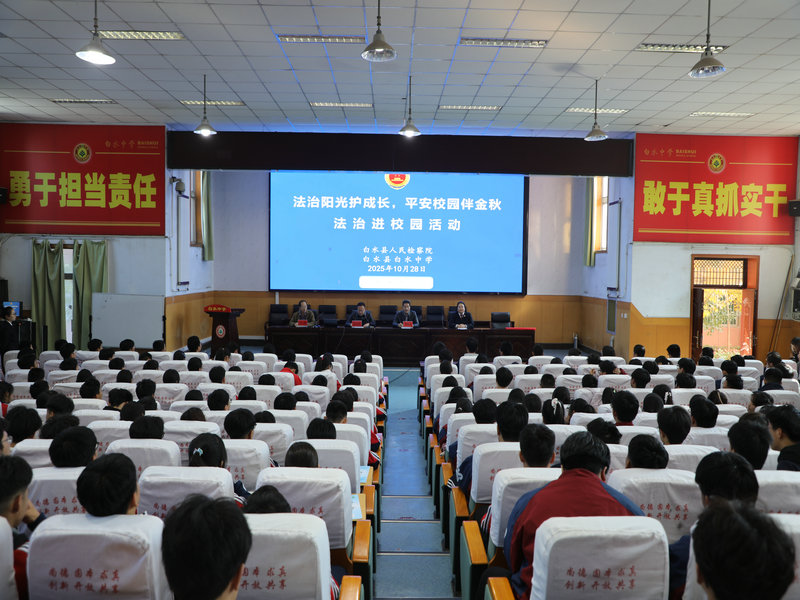 为筑牢未成年人法治安全防线,切实提升学生法律意识与自我保护能力,10月28日,白水中学携手白水县人民检察院,成功举办以《预防未成年人犯罪法》为主题的普法讲座,为金秋校园注入法治活力。活动由白水中学校长段闫宏主持,他指出法治教育是守护学生健康成长、树立规则意识的“必修课”,必须贯穿学校教育始终。