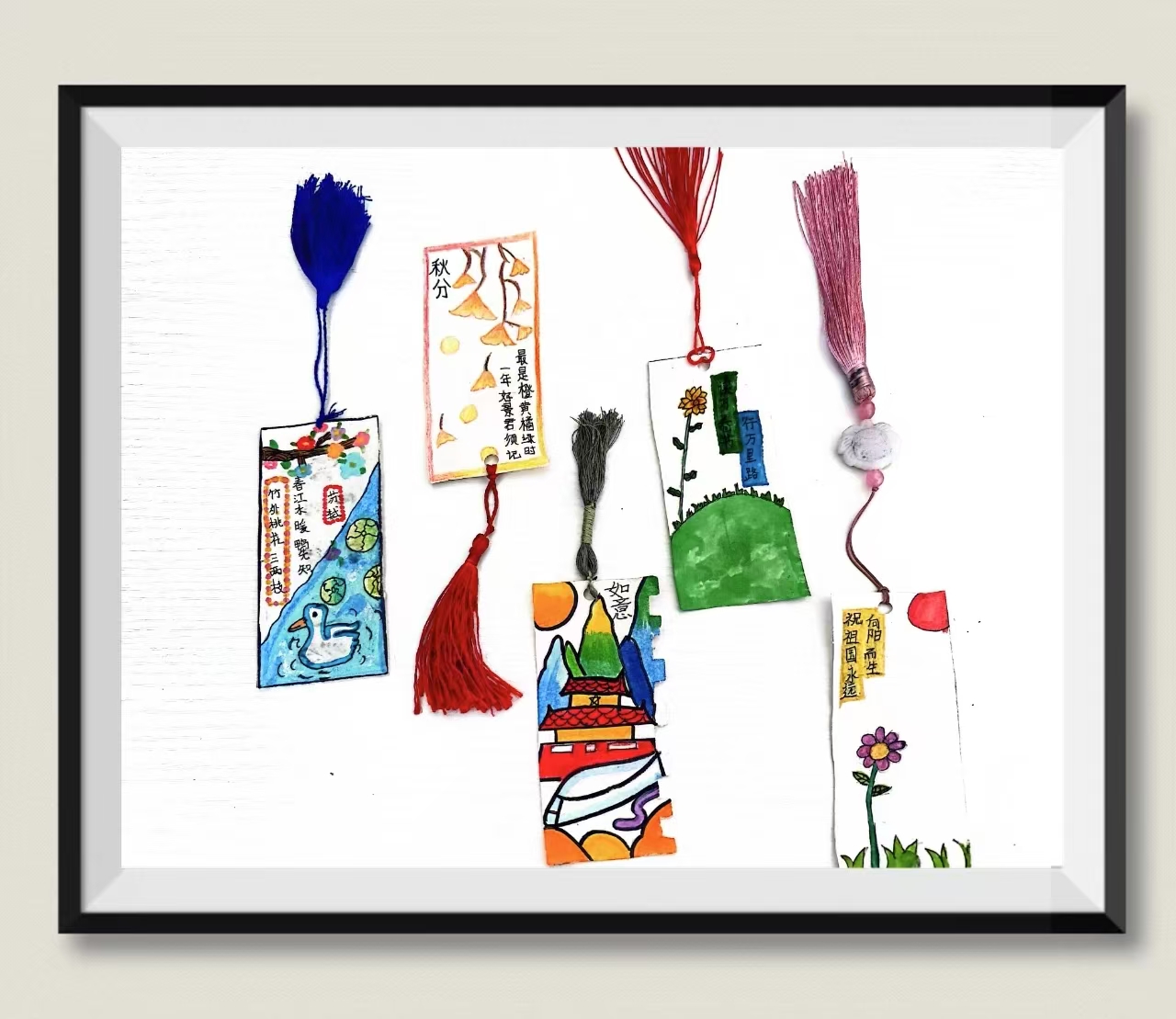 五年级创意书签:学生打造的创意书签,融诗词、节气、风景于一纸,搭配精致流苏,让阅读在文化与艺术的交融中更具诗意,尽显对语文与美学的双重探索。
