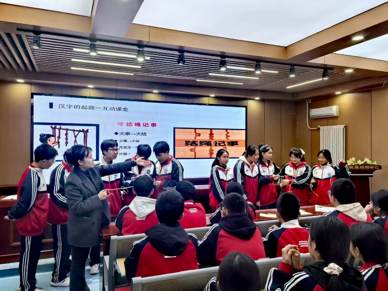 授课环节中,老师以“结绳记事”为核心切入点,带领同学们“穿越”至文字诞生前的远古时代。通过现场演示不同绳结的打法,详细讲解古人“大事打大结、小事打小结”的记事逻辑,直观呈现了文字诞生前的文明记录方式,有效激发了同学们对“文字为何诞生、如何诞生”的探究兴趣。