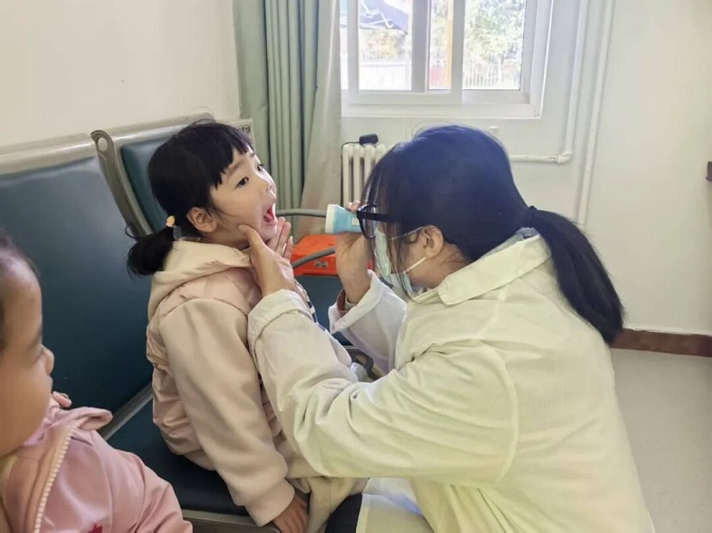 集体活动时,带班教师发现有一名幼儿精神不振,第一时间使用额温枪为幼儿测量体温,检查幼儿的体温是否正常。