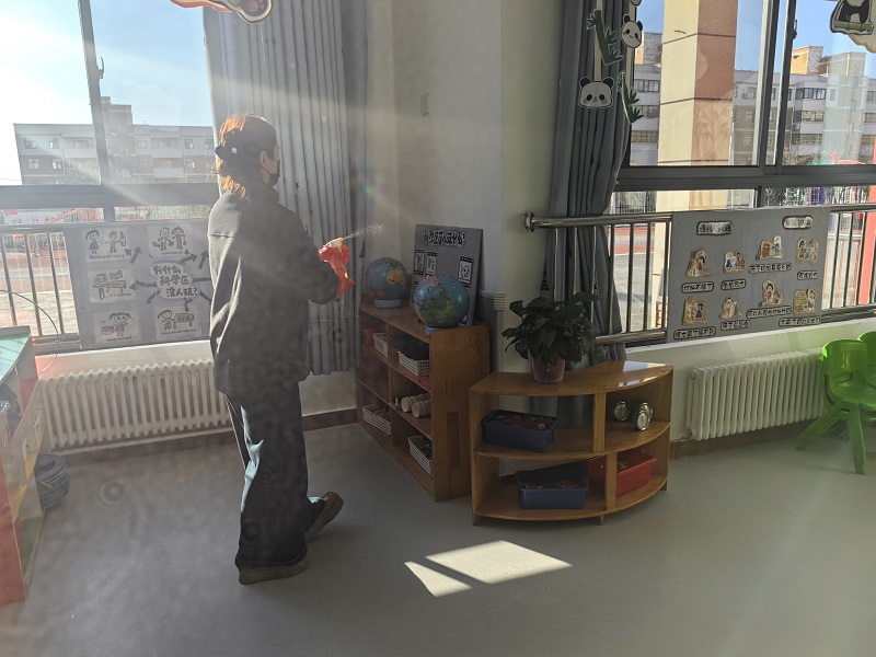 保育老师对班内以及有症状幼儿的活动轨迹进行消毒:打开门窗通风,再对活动场地喷洒稀释过的消毒水,并擦拭消毒地面、桌面、柜面、玩教具等。整体活动室消毒30分钟。