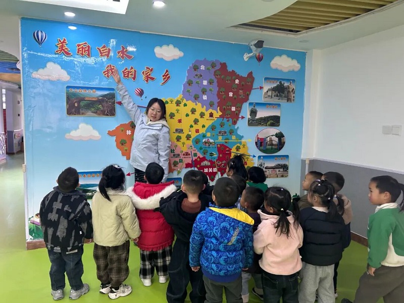 小班教师以幼儿熟悉的生活场地为起点:从每日相伴的幼儿园,延展至温馨的小家,再落向地图上的广阔疆域,轻声道:“祖国是藏着千万个家的温暖港湾,我们都在这港湾里呀。”孩子们抬着小脸,目光追着墙上的掌印与星标,将“小家之亲”“园所之暖”与“家国之怀”,悄然种进了心底。