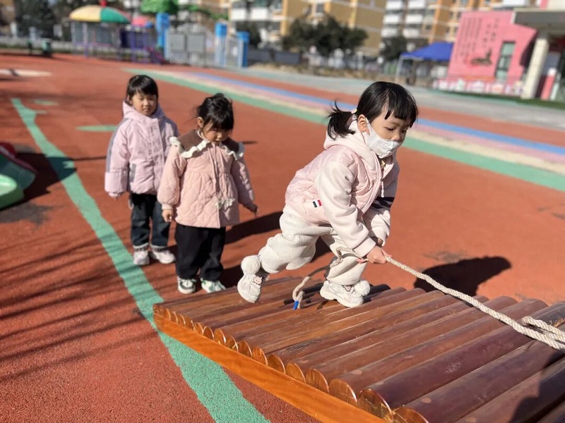 中班的孩子们在趣味运动中践行着延安精神:铁锁步道上,小手紧攥扶手、小脚稳稳踩住踏板,是“坚守”的勇气;“飞夺泸定桥”里,小手攥紧绳索、彼此借力稳步向前,是“协作”的默契。这些撒满阳光的运动瞬间,让“奋斗、协作”的红色精神,在孩子们的笑闹与坚持里悄悄扎根。