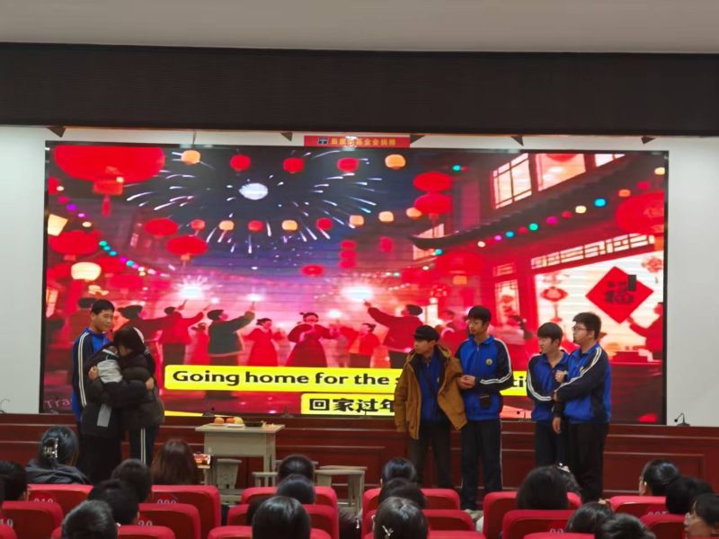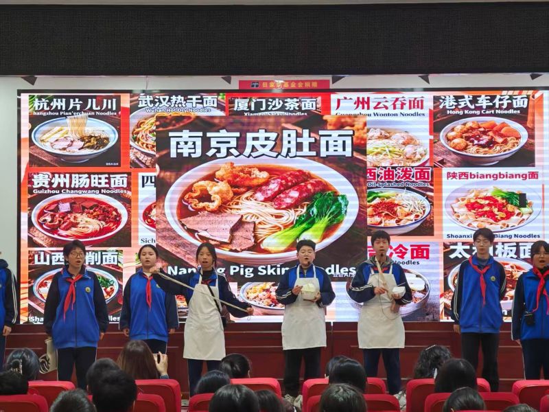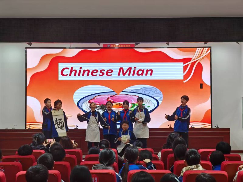 八年级思辨舞台,共情满分以“会思考、善表达”为目标,八年级学子用深度演绎让英语成为思想传递的载体!《The Little Match Girl》在飘雪背景中,以轻柔台词与颤抖动作,将孤独与期盼诠释得淋漓尽致;《Going Home for Chinese New Year》用红灯笼、烟花烘托节日氛围,英语介绍春节习俗,温暖又治愈。《Yu Gong Moves the Mountains》以剪纸风背景搭配坚定表演,诠释“持之以恒”的中国精神;《Zootopia》《The Fisherman and the Goldfish》聚焦梦想与成长,细腻情绪刻画传递深刻主题。《Chinese Noodles》将美食文化搬上舞台,“厨师”们生动模仿拉面、切面动作,用英语介绍面条种类与风味,搭配“面”字书法道具,让中国味在英语表达中绽放光彩。