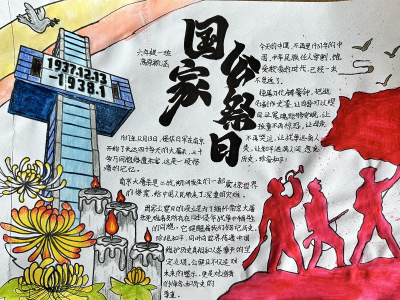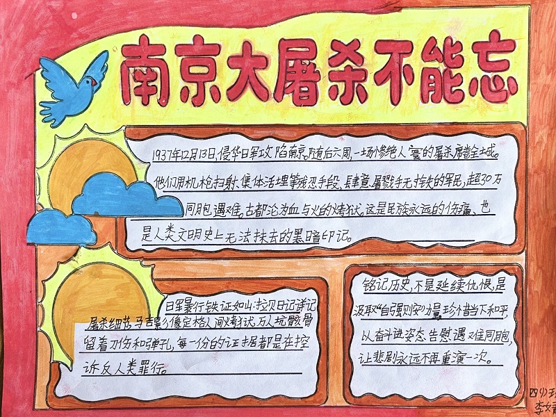 此外,学校还通过多维宣传营造浓厚教育氛围:校园广播站推出公祭日专题节目,播报历史知识、诵读和平篇章;校门口电子屏滚动播放“勿忘国耻、吾辈自强”等标语及历史图片,时刻提醒师生铭记过往、汲取力量。
