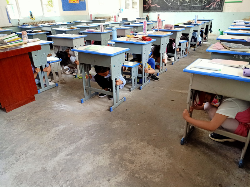 本次防震演练由学校政教处策划、组织,校长魏建波亲自担任总指挥。随着防空警报拉响,正在上课的教师们立即停止授课,组织学生用手护住头就近或蹲或躲在课桌下,防空警报再次响起,同学们将书本顶在头顶或双手抱头迅速进行安全撤离,上课教师快速检查教室,确保不落一人后迅速撤离教室,班主任在集合地组织学生集合并清点人数,整个演练过程紧张有序,每个班级按照预定路线快速撤离,达到了预期效果。