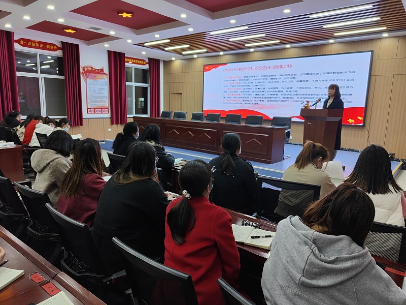 大会第一项,德育主任冯丽娜带领全体教师学习了《新时代教师职业行为十项准则》《中小学教育惩戒规则(试行)》《渭南市教育系统加强教师队伍师德师风建设八严禁》等教育法规制度,要求大家明确目标要求,认真落实学习内容,不忘立德树人初心,牢记教育使命,积极探索新时代教育教学方法,不断提升教书育人本领,严于律己,以身作则,率先垂范。